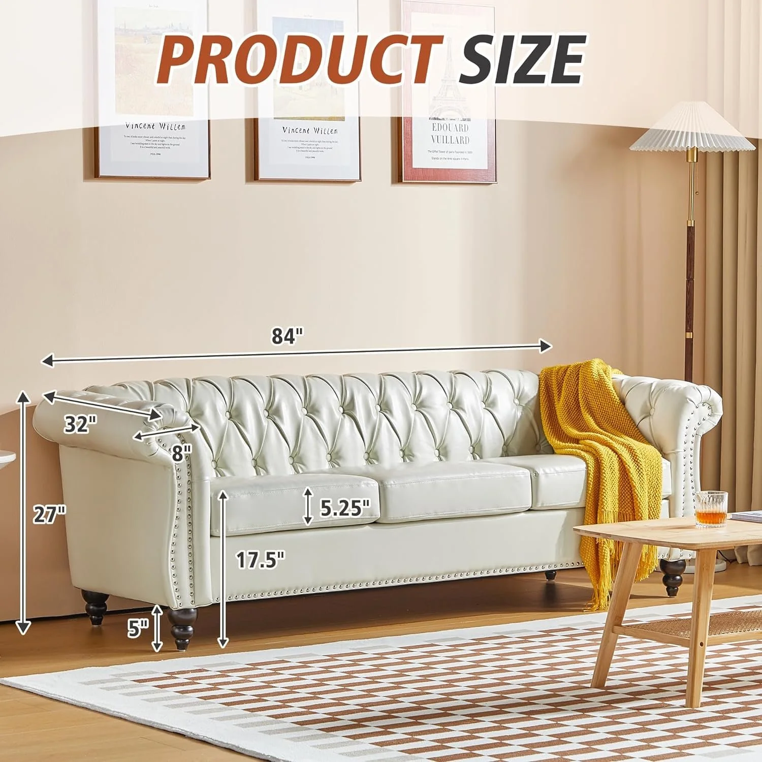 3 Piece Living Room Set, Chesterfield Faux Leather Sofa Loveseat Couch Chair with Scroll Arms and Nailhead for Living Room, Office (White)