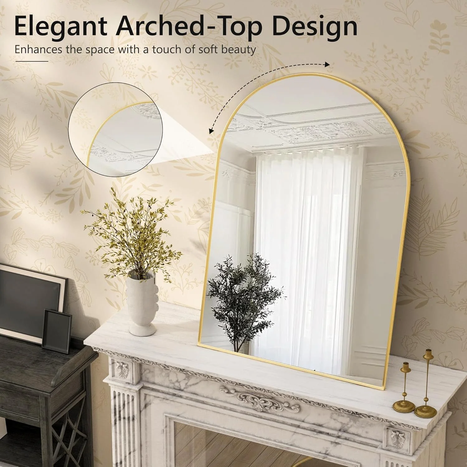 Enhance your home's elegance with the 24'' x 36'' Gold Arched Wall Mirror. This mirror features a classic arched design, a durable aluminum alloy frame, and high-definition reflection, making it perfect for vanity use, bathroom decor, or stylish wall accents.