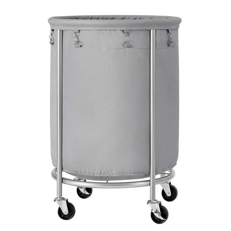 Tired of lugging a heavy bag to the laundry room? This Round 45-Gallon Laundry Basket Hamper with Grey Fabric Bag Steel Frame on Wheels comes to help. With 4 casters, even your kid can roll the laundry to the washer.With a 23.6L x 23.6W x 31.9H size, this laundry hamper boasts a large capacity for lots of clothes and bedding, so you dont need to take several hampers on laundry day. Crafted with a sturdy powder-coated metal frame and premium 600D polyester fabric, this laundry hamper is durable for years to come. This hamper comes with clasp design instead of hook-and-loop fasteners for tighter connection, so you will never worry about the bags falling off even when filled to the max (max. load: 33 lb). Easy-peasy! Fooled by the large hamper and thought the assembly will be troublesome? Nah. With numbered parts and easy-to-follow instructions, youll have your laundry corralled in no time.