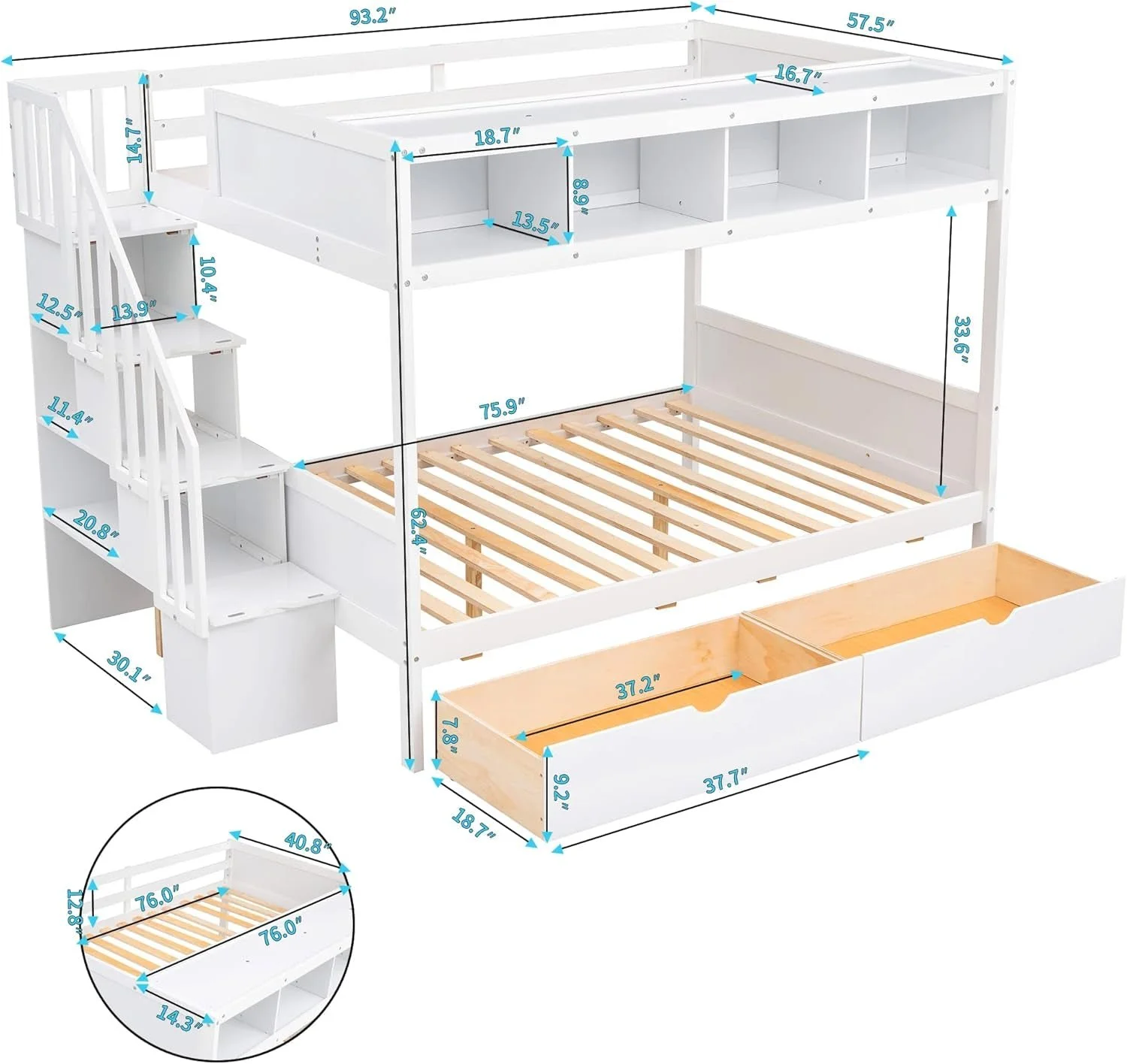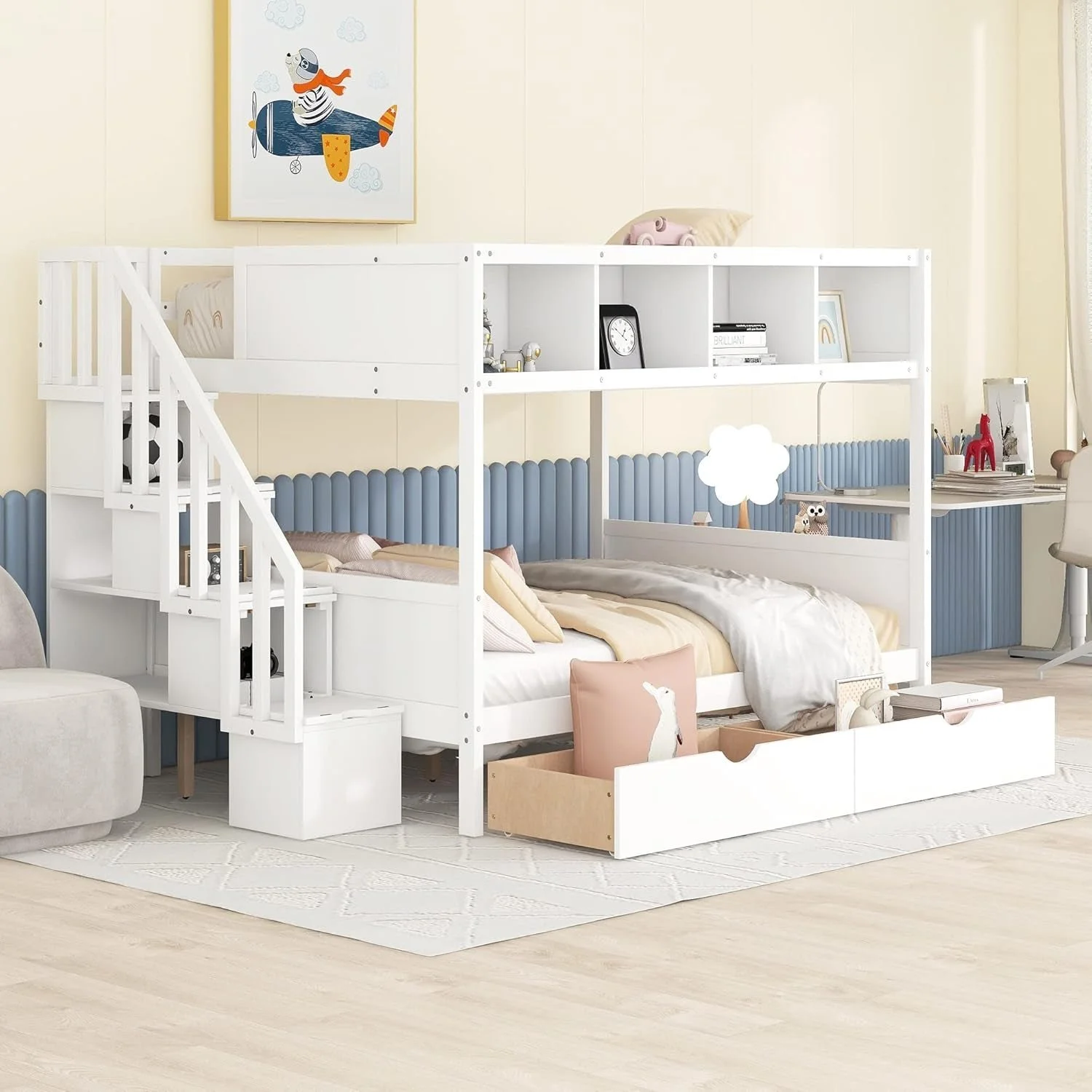 Whether your little ones share a room or it's just for one who loves sleepovers, this bunk bed is the perfect pick. It features a twin over full design with shelfs & storage staircaset. A modern addition to your ensemble, this bunk bed offers slatted paneling and a modern finish. This piece includes two under-bed drawers for you to store your blankets and toys. The shelf is guard rail to keep your safe, also will make a beautiful glance in your room with some decor.